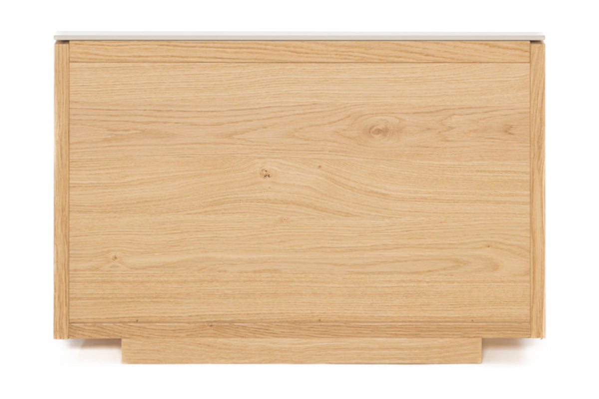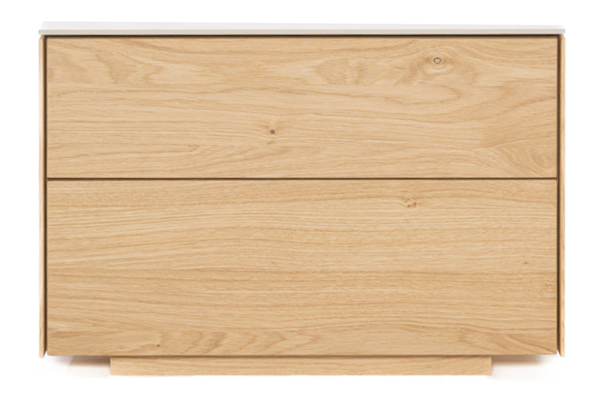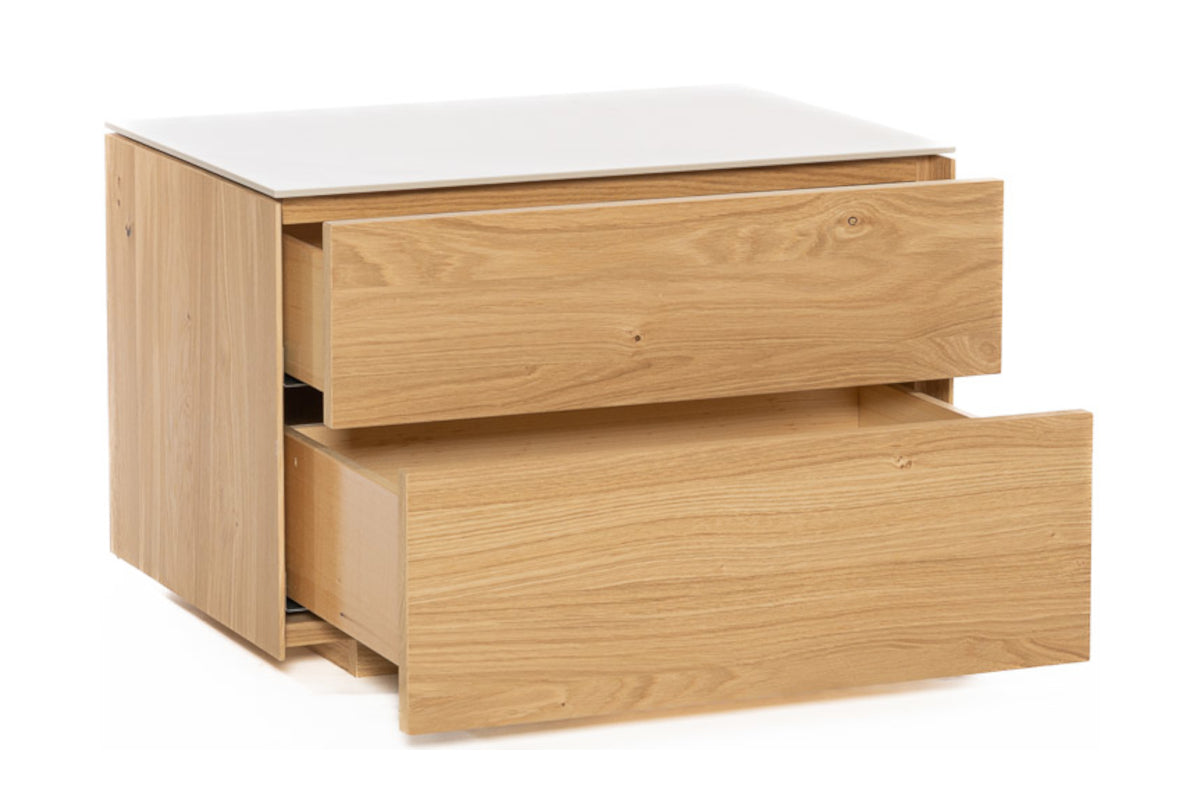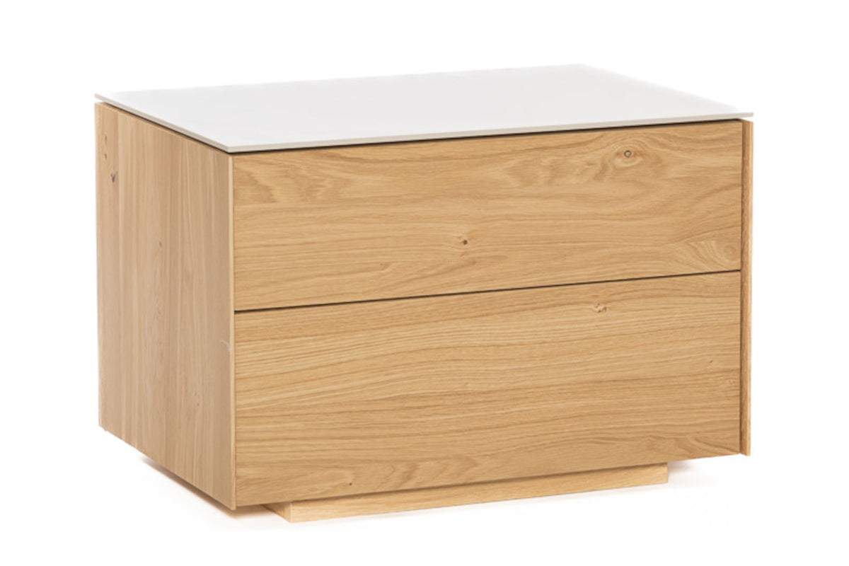 The Avita Bedroom is modern and sleek. The 2-drawer nightstand features a rustic white oak finish with a white porcelain top. Drawers are mounted on push to open slides.