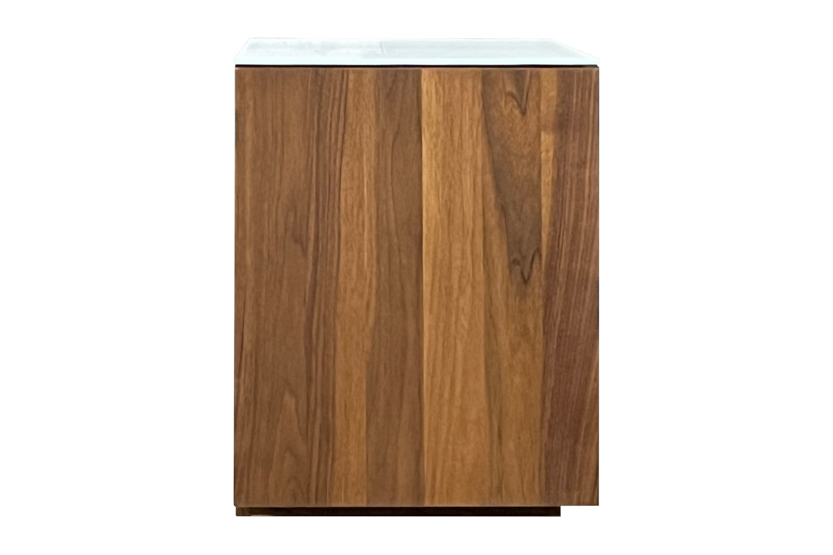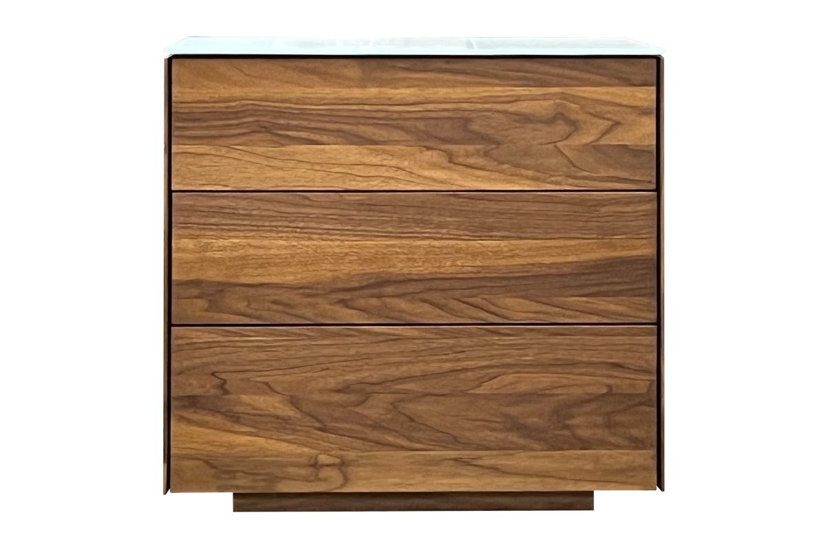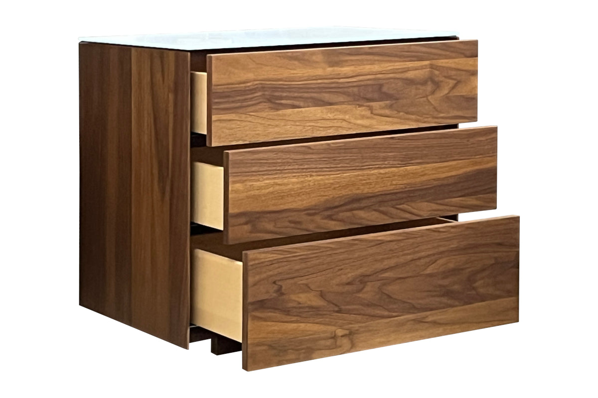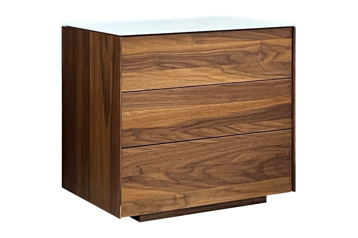 The Avita Bedroom is modern and sleek. The 3-drawer nightstand features a smoked walnut finish with a white glass top. Drawers are mounted on push to open slides.