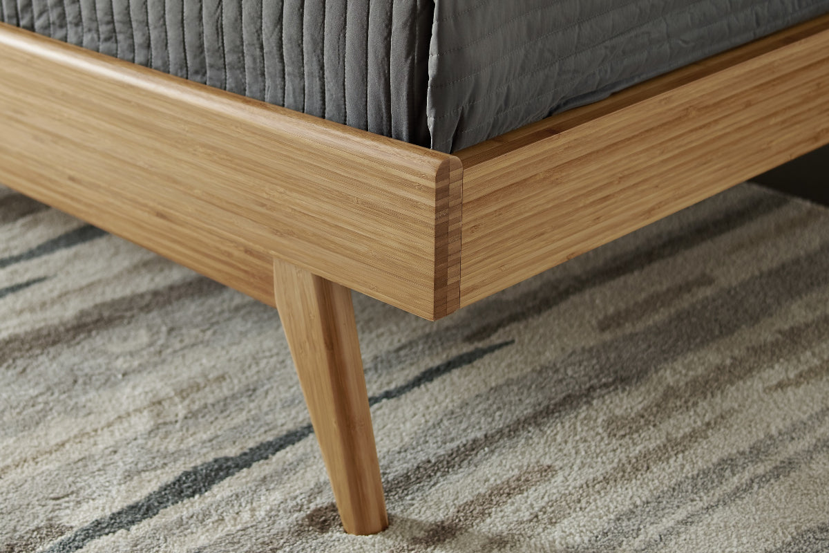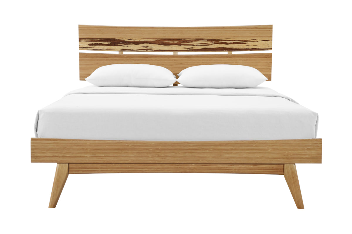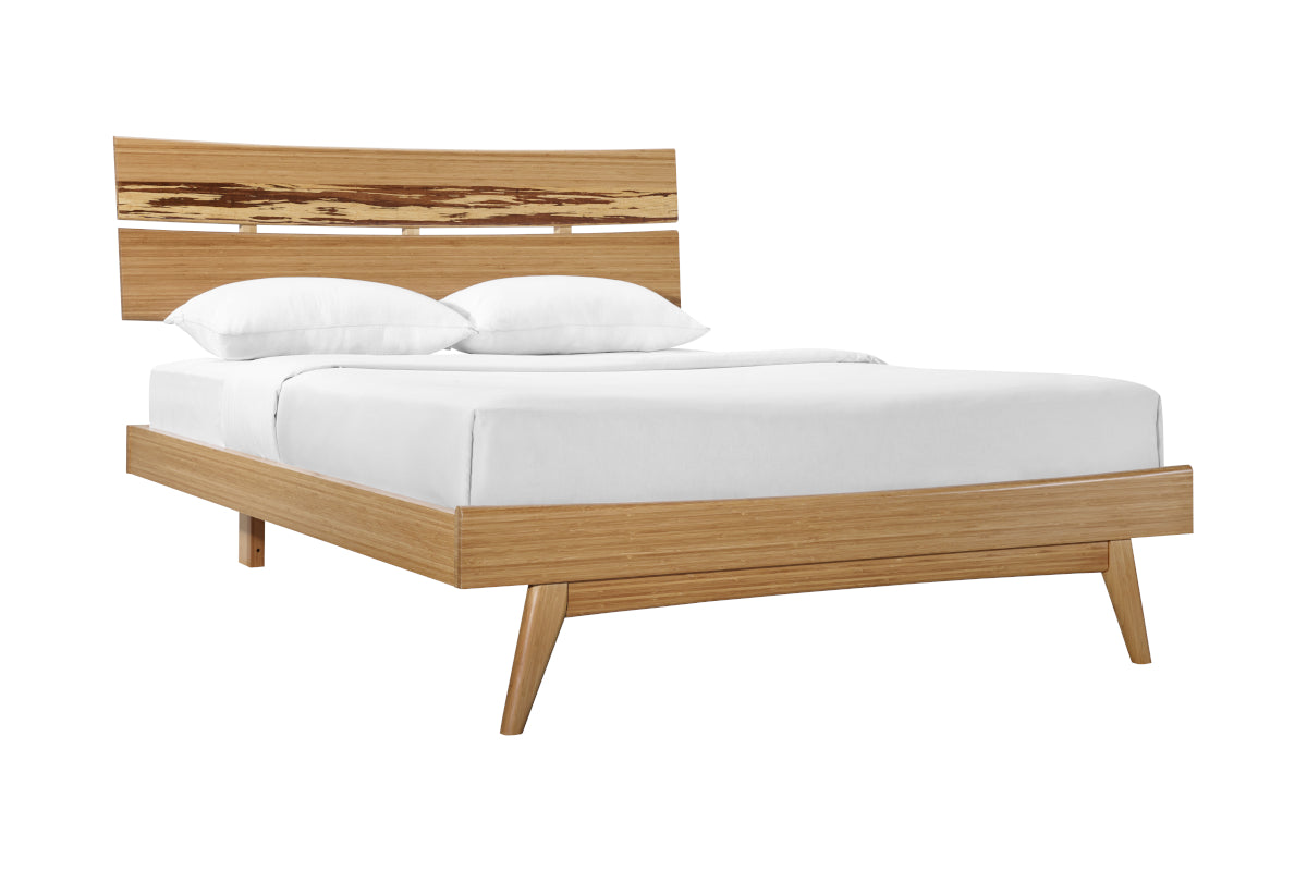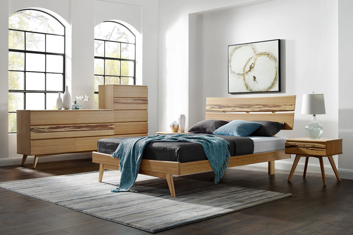 Expertly crafted in earth friendly solid bamboo, the Azara platform bed features sleek mid-century styling, clean lines and modern angled tapered legs. The elegant sweeping headboard shows off a beautiful accent panel crafted in solid exotic Tiger bamboo. Completing the bedroom group, the matching Azara bedroom chests each feature a coordinating accent drawer faced in solid exotic Tiger bamboo, with soft close drawers and under mount drawer glides.