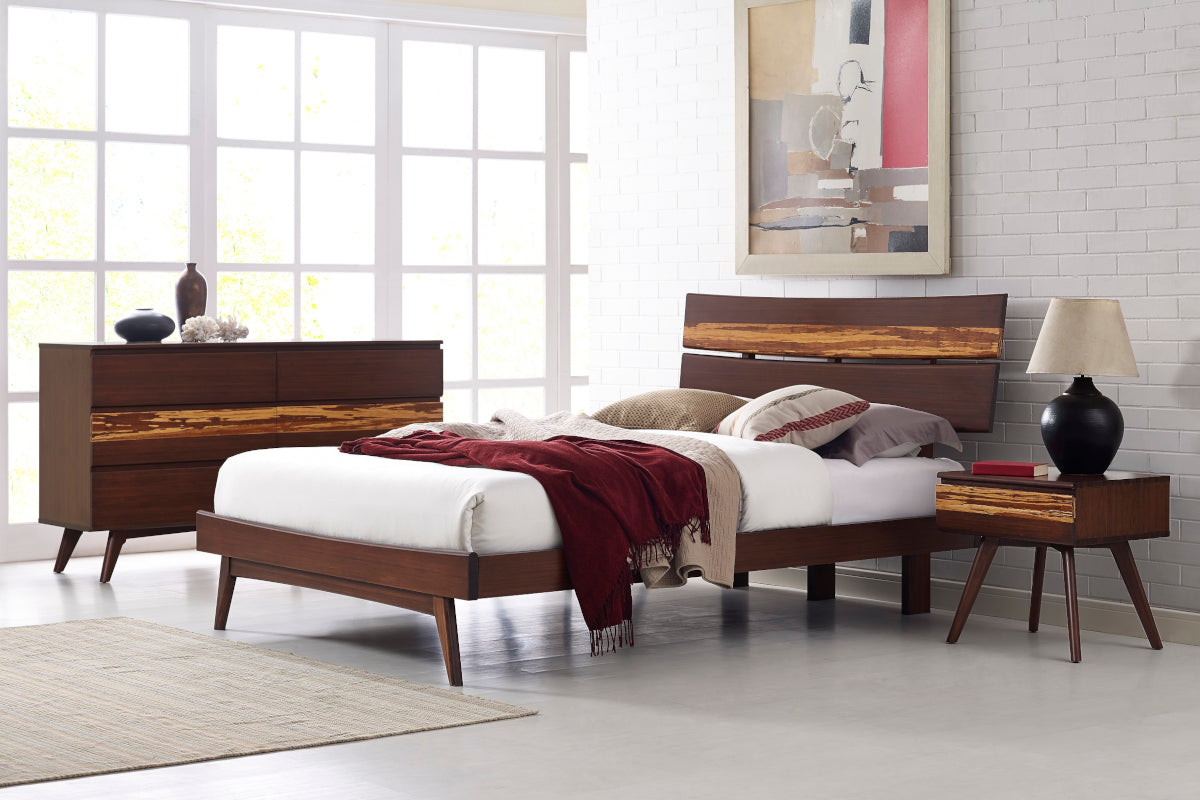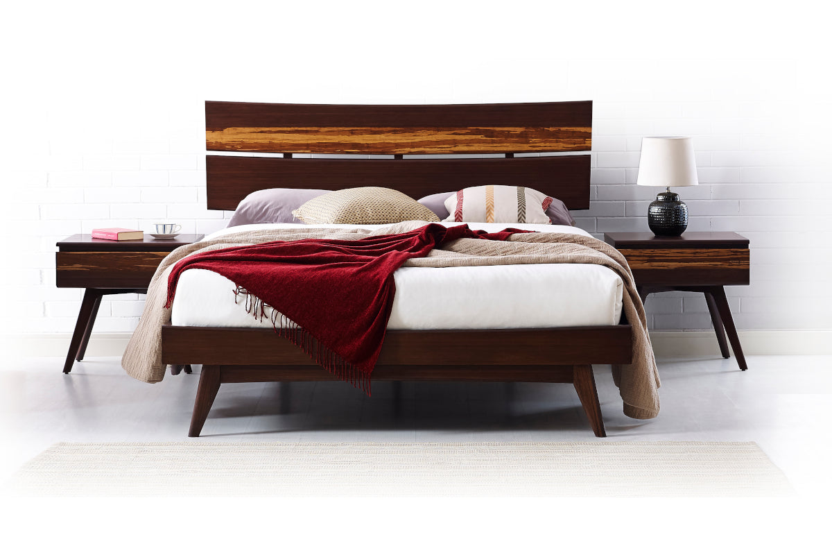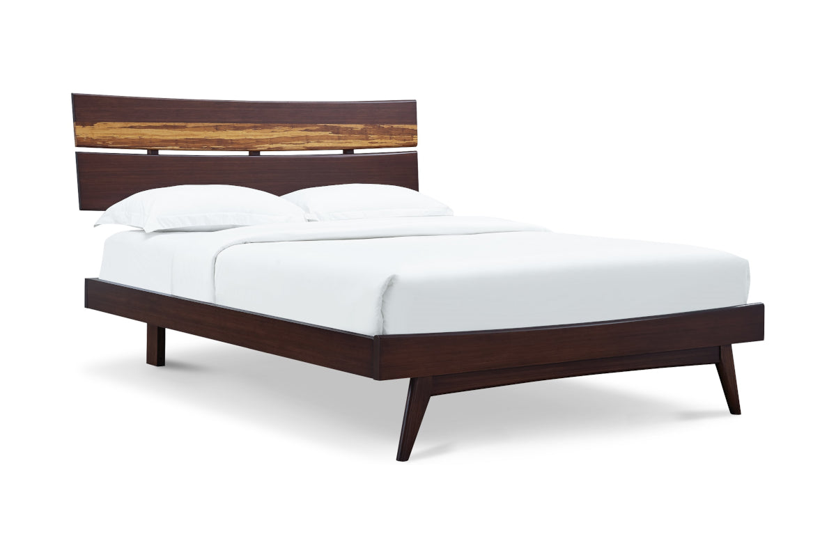 Expertly crafted in earth friendly solid bamboo, the Azara platform bed features sleek mid-century styling, clean lines and modern angled tapered legs. The elegant sweeping headboard shows off a beautiful accent panel crafted in solid exotic Tiger bamboo. Completing the bedroom group, the matching Azara bedroom chests each feature a coordinating accent drawer faced in solid exotic Tiger bamboo, with soft close drawers and under mount drawer glides.