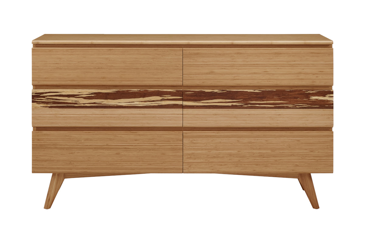 Expertly crafted in earth friendly solid bamboo, the Azara bedroom collection features sleek mid-century styling, clean lines and angled tapered legs. The elegant sweeping headboard shows off a beautiful accent panel crafted in solid exotic Tiger bamboo. Exotic Tiger combines the light and dark material, creating a unique and beautifully striped grain with continuous colors throughout. Variation in grain and color enrich the natural beauty of bamboo furniture and make each piece unique. Slight differences in bamboo shade colors are signs that the furniture has been crafted from solid bamboo and is considered a benchmark of quality. Available in Queen or Eastern King, and California King sizes, the Azara is available in both caramelized and rich Sable finish. The coordinating Azara bedroom chests each feature an accent drawer faced in solid exotic Tiger bamboo, angled tapered legs, hidden under mount drawer glides and soft closing drawers. Greenington combines beautiful design, rich colors and a winning sustainability story.