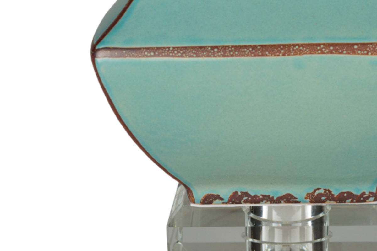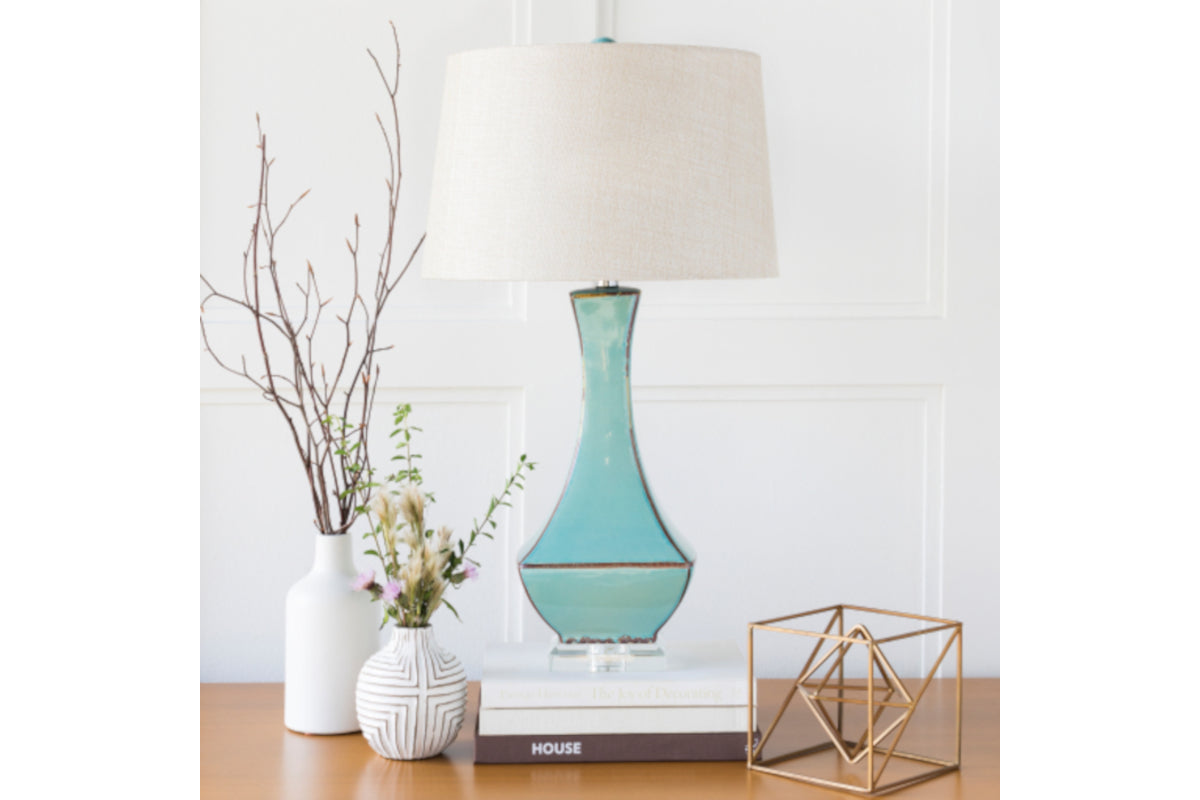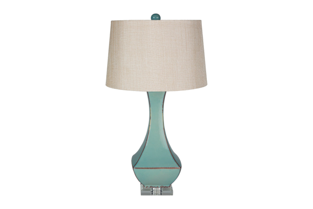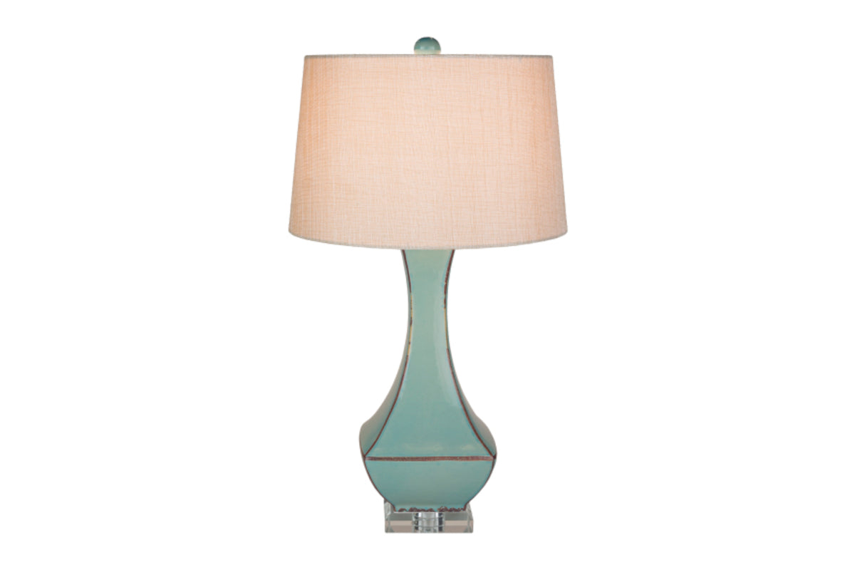 The Belhaven table lamp features a teal glazed ceramic body with an ivory faux silk shade and translucent crystal base. The Belhaven has a 6' cord and 3-way switch.