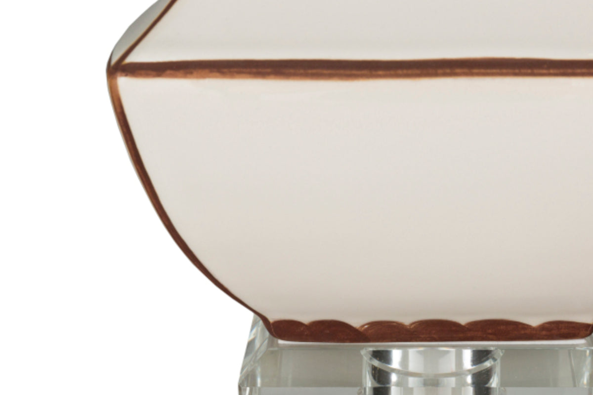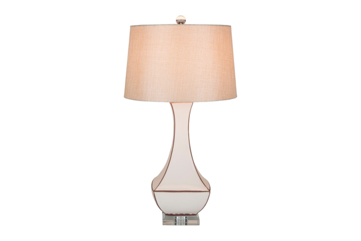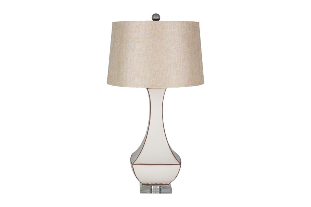 The Belhaven table lamp features a khaki white glazed ceramic body with an ivory faux silk shade and translucent crystal base. The Belhaven has a 6' cord and 3-way switch.