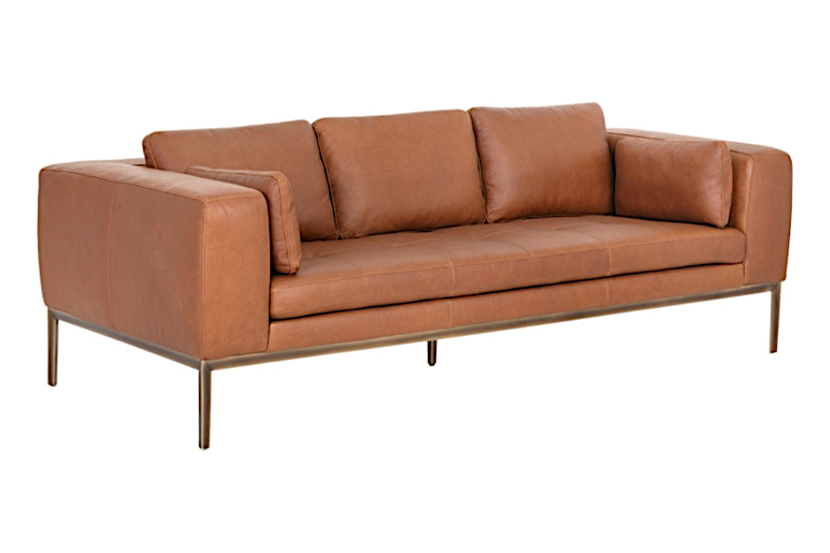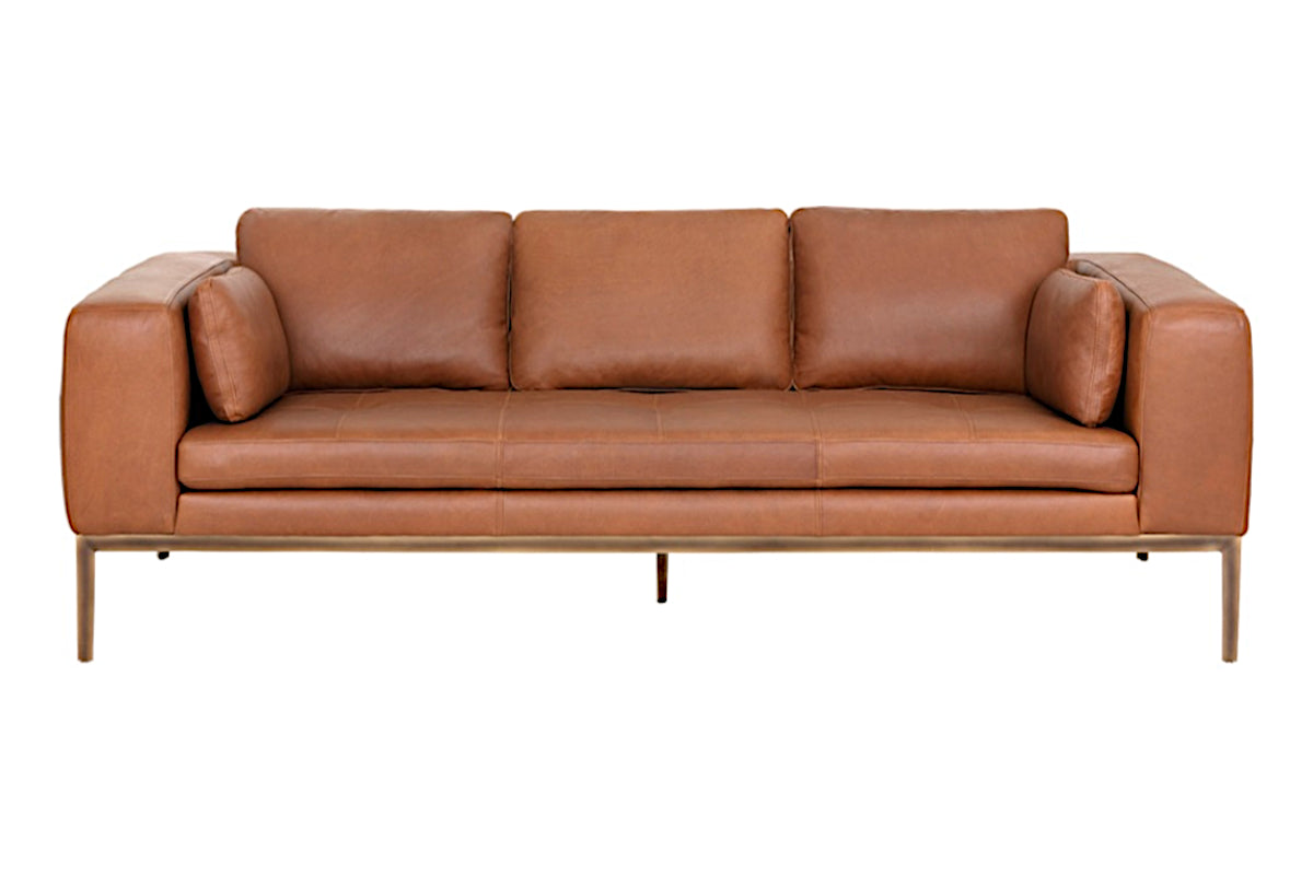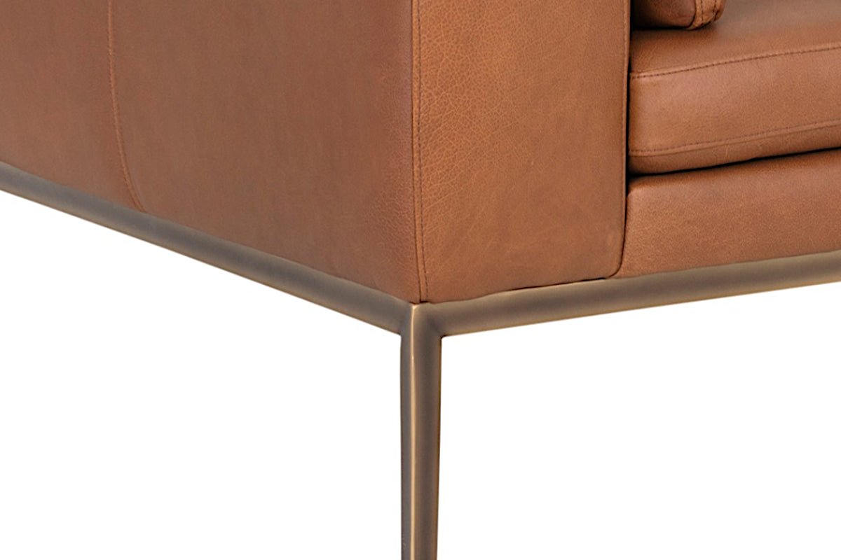 A masculine sofa with a modern design. Features an oversized seat and armrests with behike saddle leather and antique brass feet. Can be paired with coordinating chair. This design has been crafted with leather. Leather is a natural material; as such markings, wrinkles, grooves and light scratches are acceptable and appreciated characteristics. No two pieces are alike.