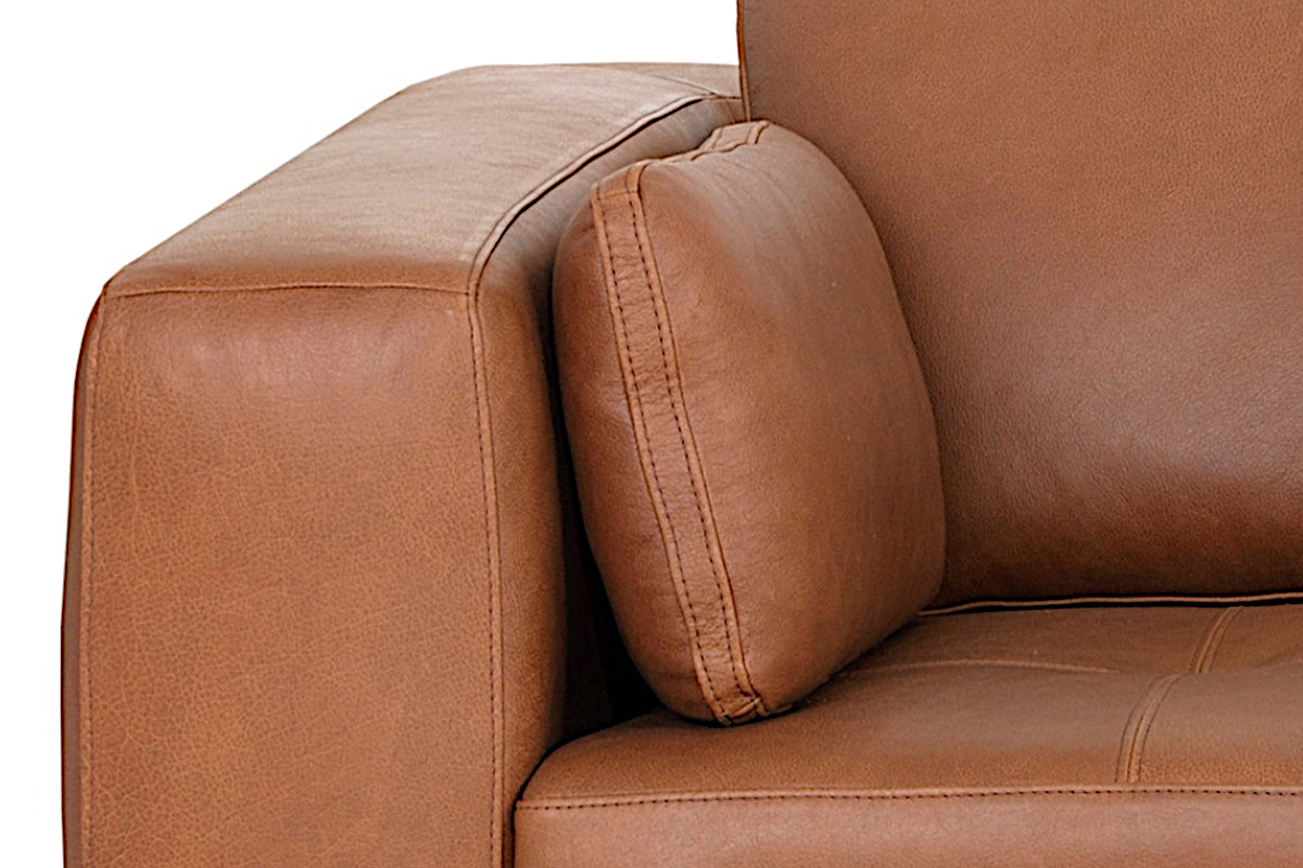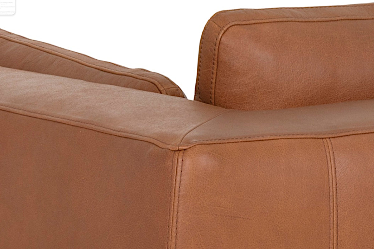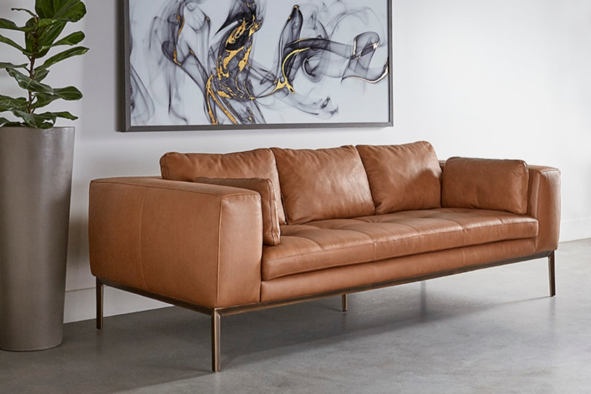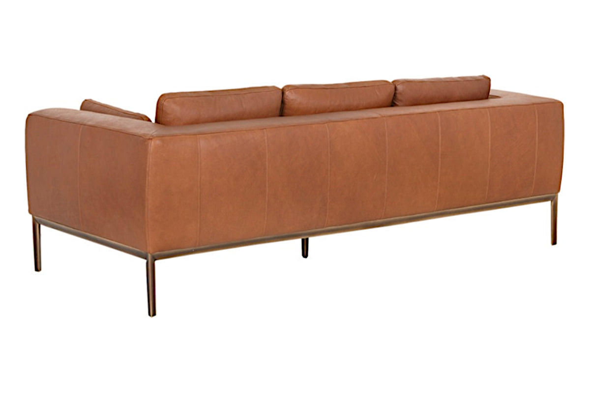 A masculine sofa with a modern design. Features an oversized seat and armrests with behike saddle leather and antique brass feet. Can be paired with coordinating chair. This design has been crafted with leather. Leather is a natural material; as such markings, wrinkles, grooves and light scratches are acceptable and appreciated characteristics. No two pieces are alike.