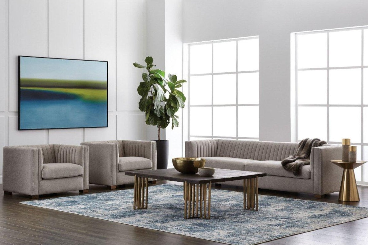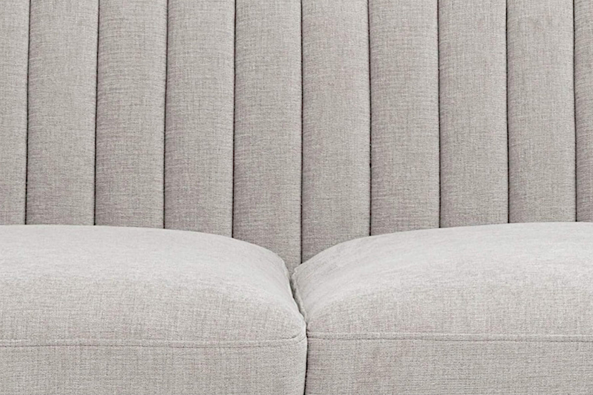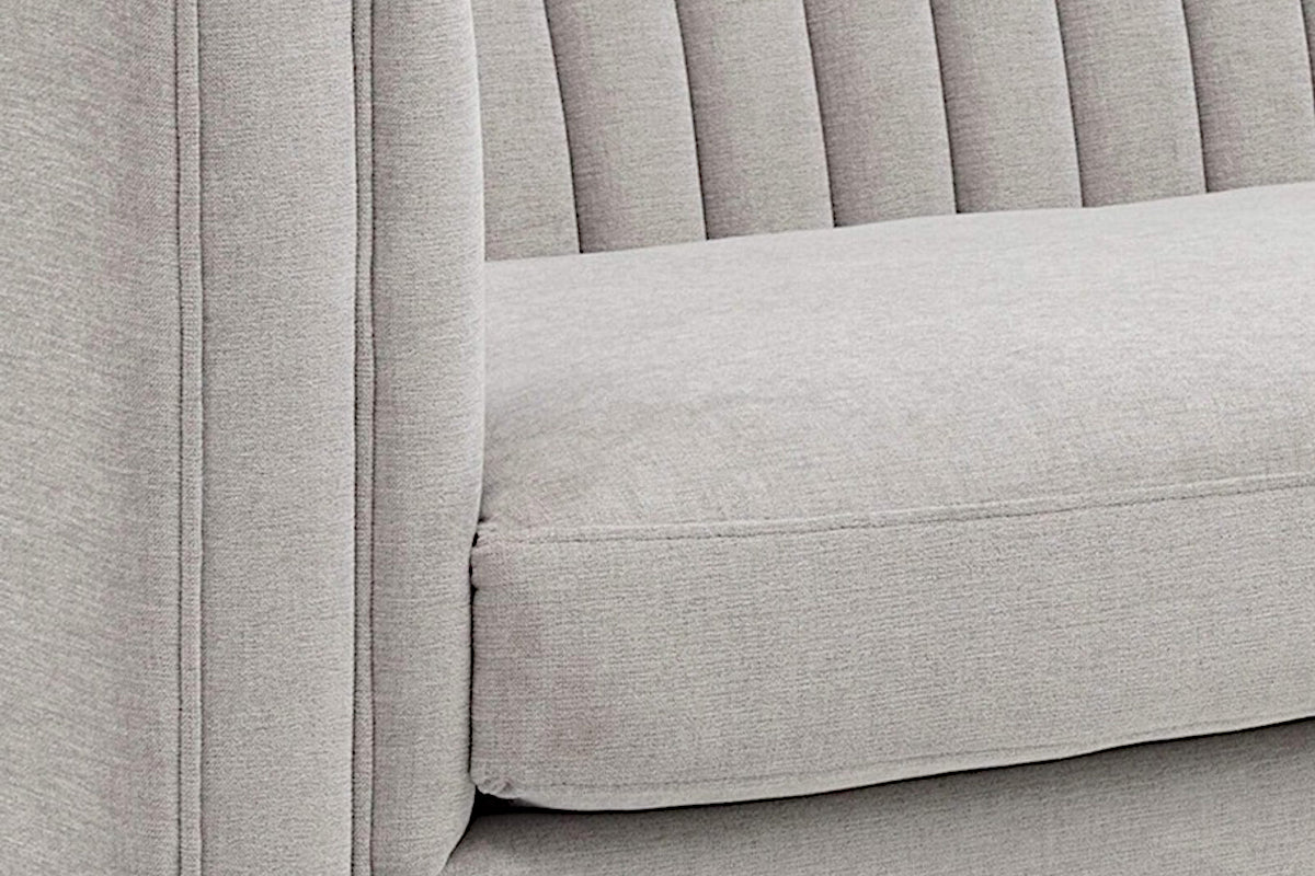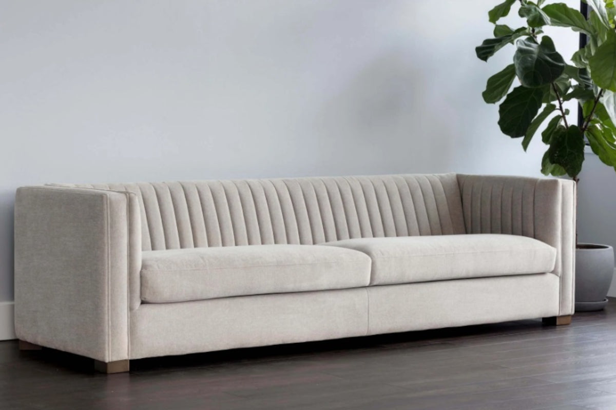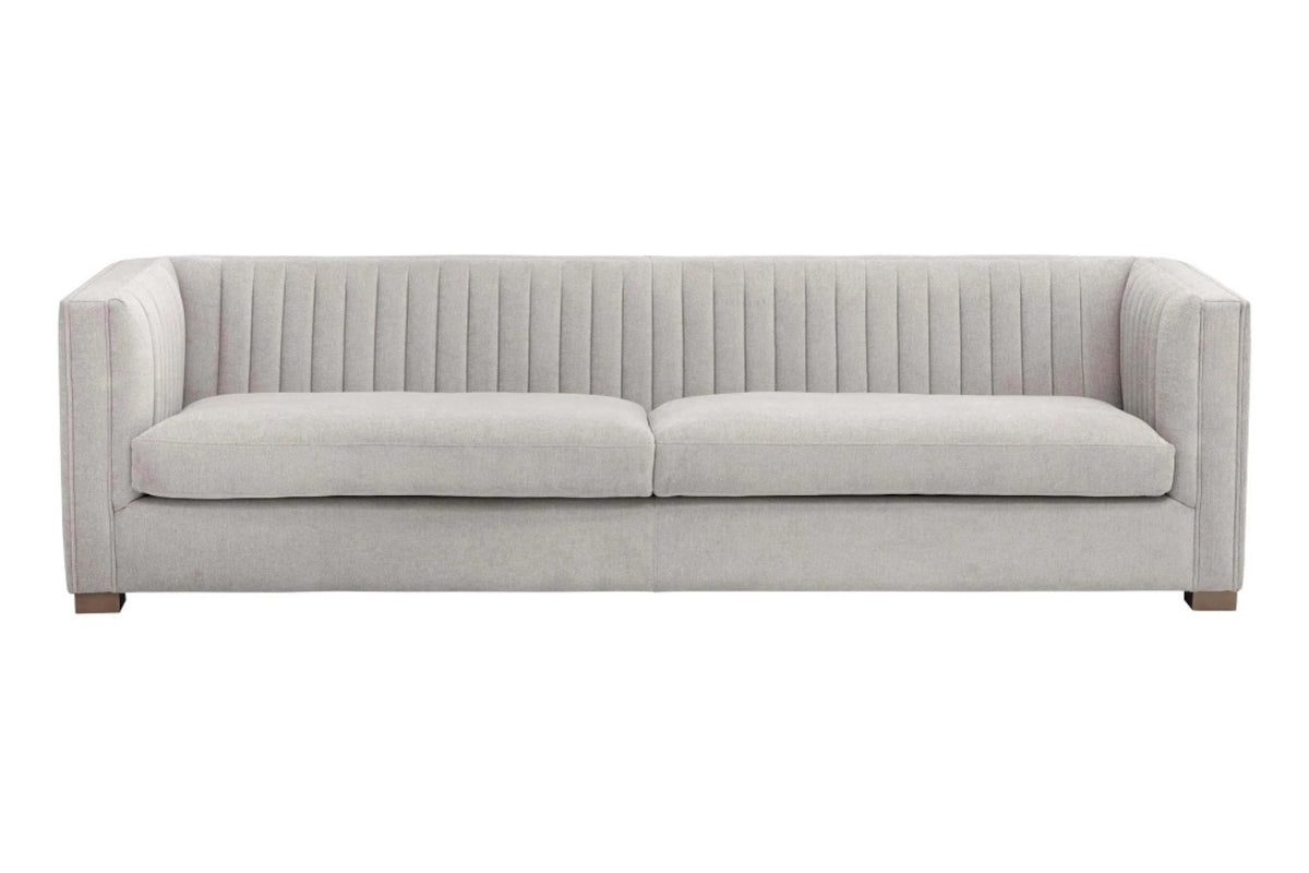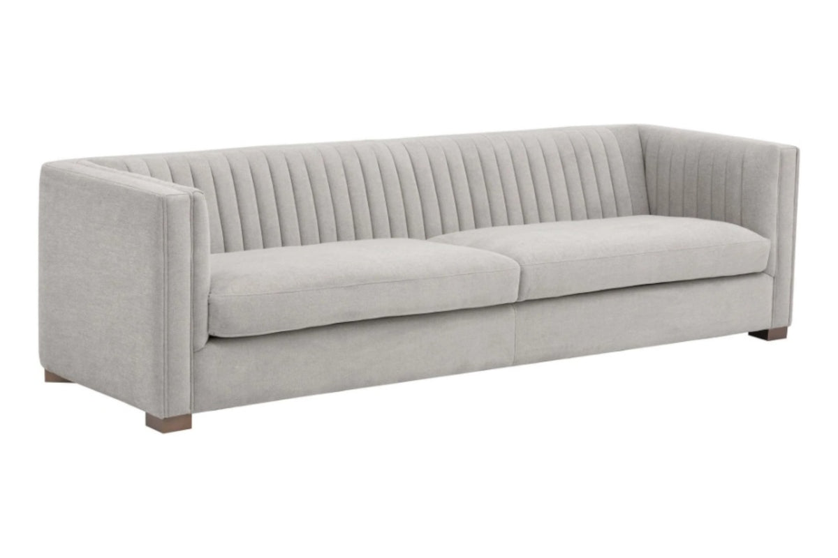 Make a statement with this sofa from our Club Collection featuring striking channel tufting on the seatback. Stocked in Hemingway silver fabric with antique brass feet. Suitable for residential and commercial environments.