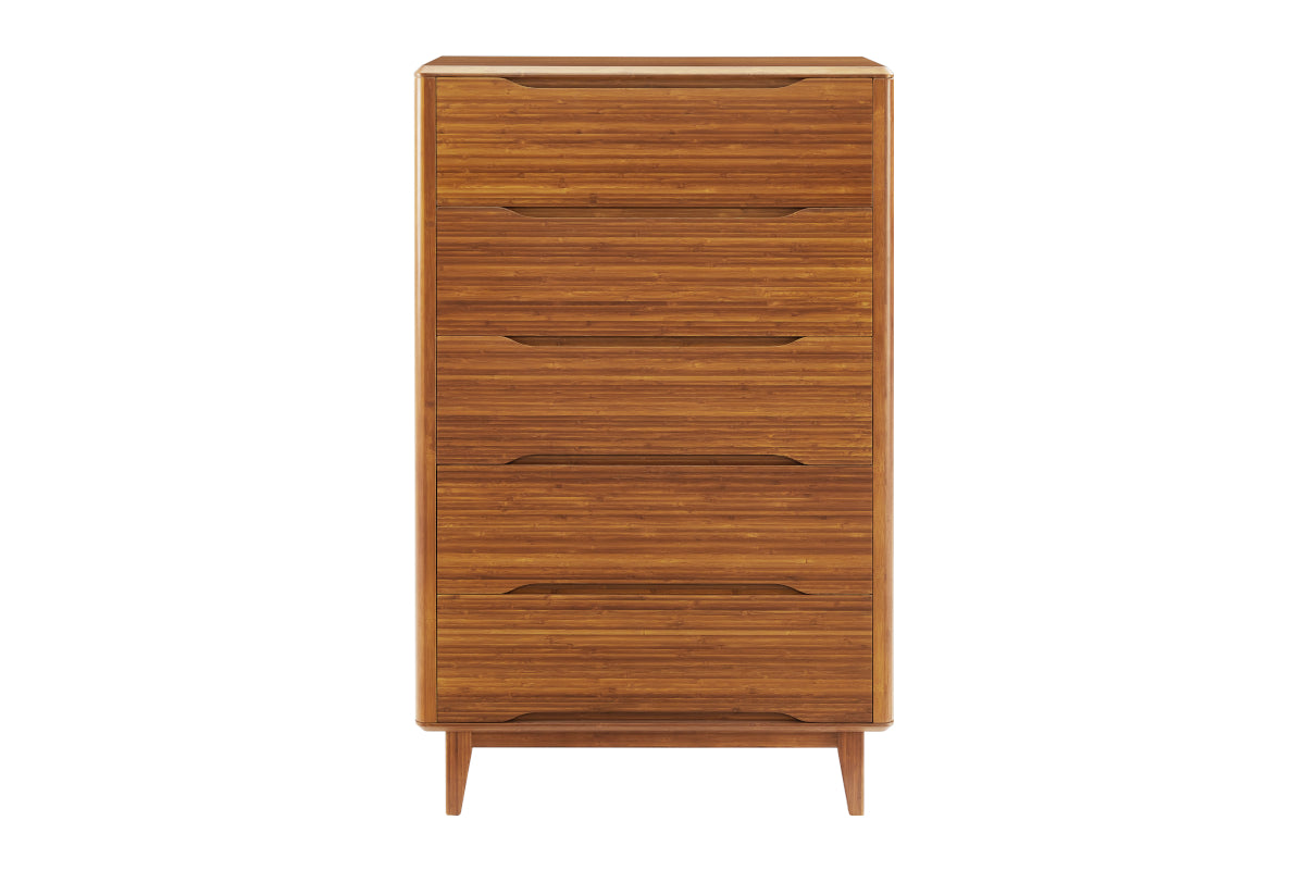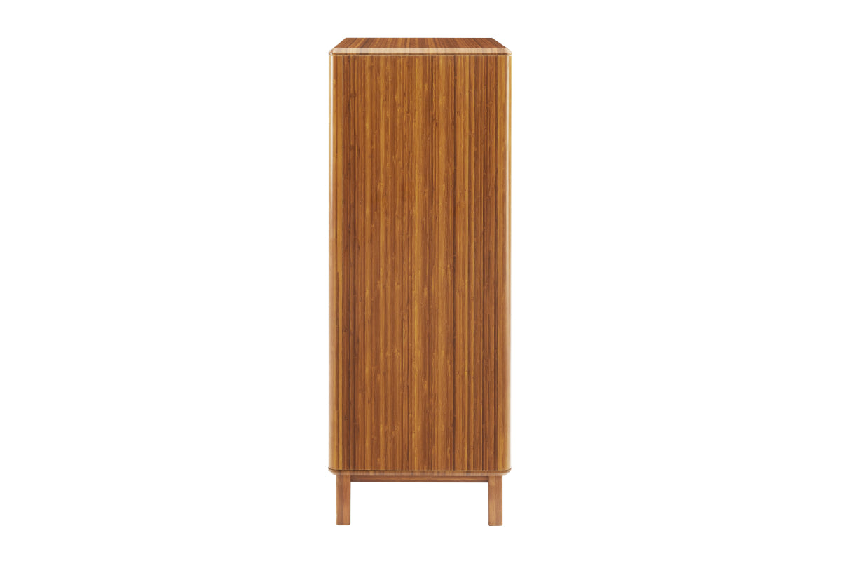 Inspired by Scandinavian modernism, the simple lines of the Currant high chest bring a fresh and simple elegance into the modern home. Enhanced by the natural Amber finish, the bamboo's lively grain will catch your eye showcasing the beautiful color and grain of solid bamboo. Beautifully finished on all four sides, the Currant’s smooth design and softly rounded corners feature other fine woodworking details including sleek recessed drawer pulls, and handsomely shaped legs which taper towards the floor.