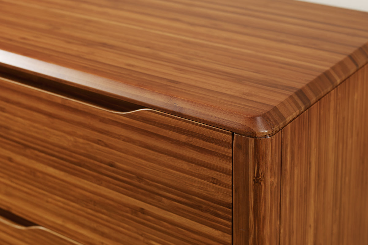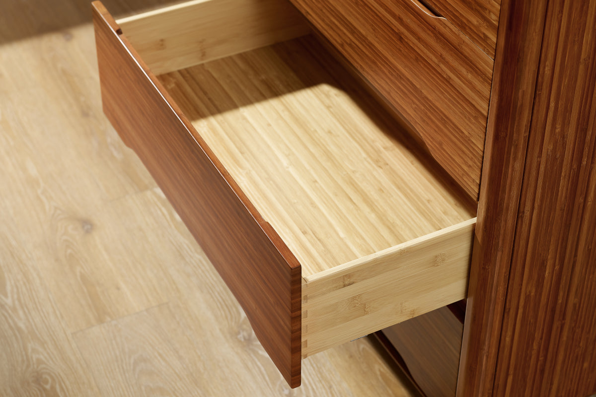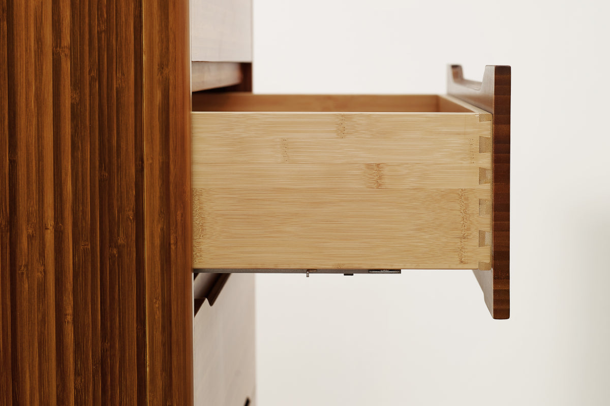 The Currant high chest features solid bamboo drawer boxes which are finished inside and out, constructed using English dovetail joinery, and using soft closing, under mount drawer glides.