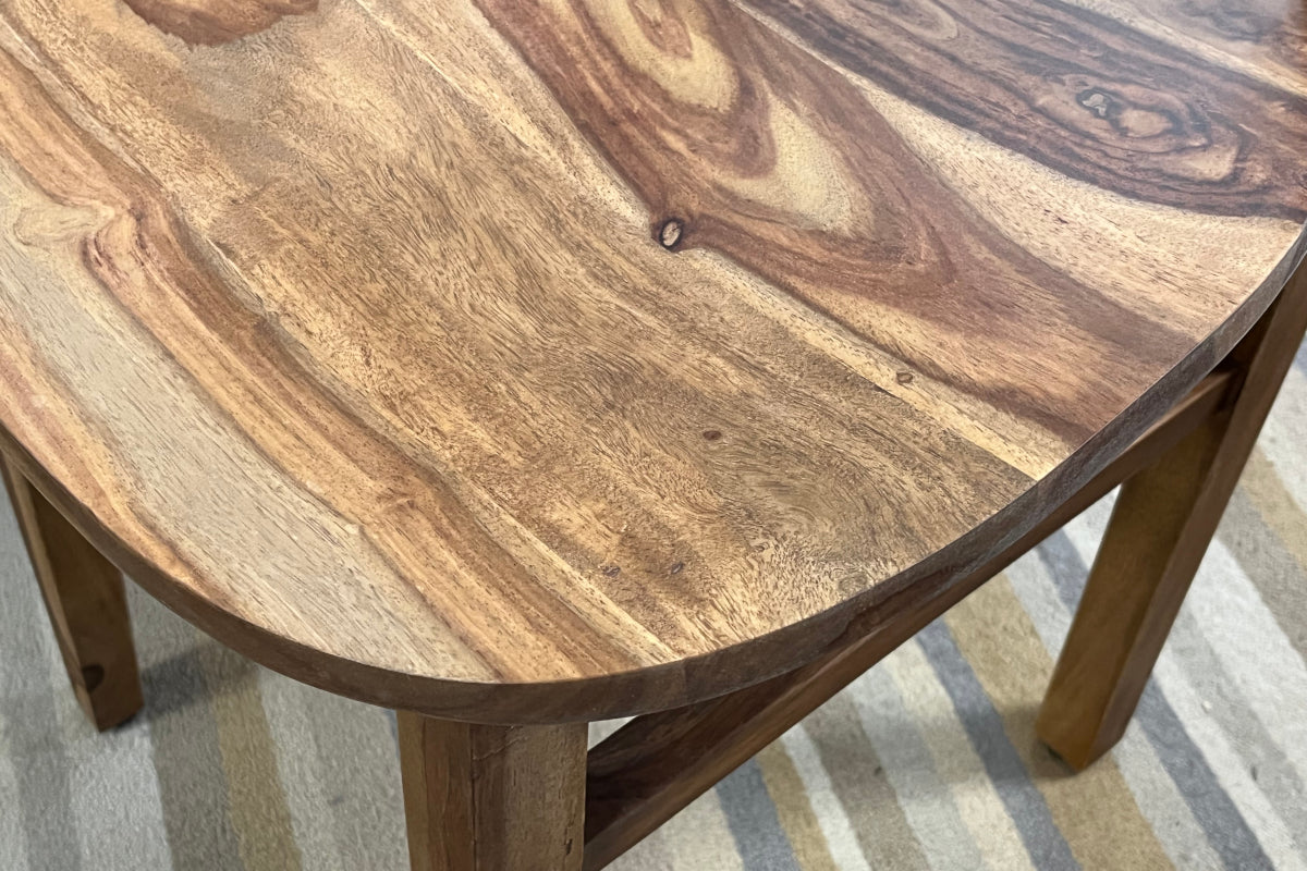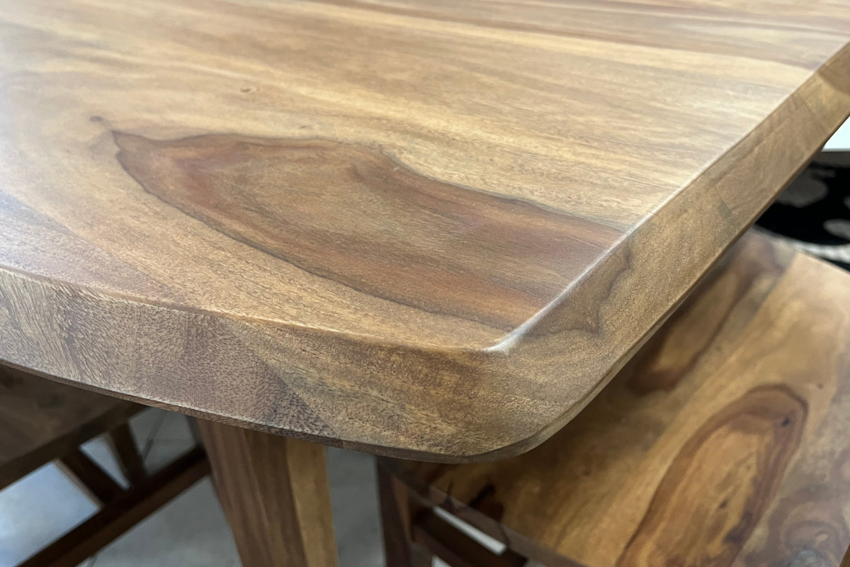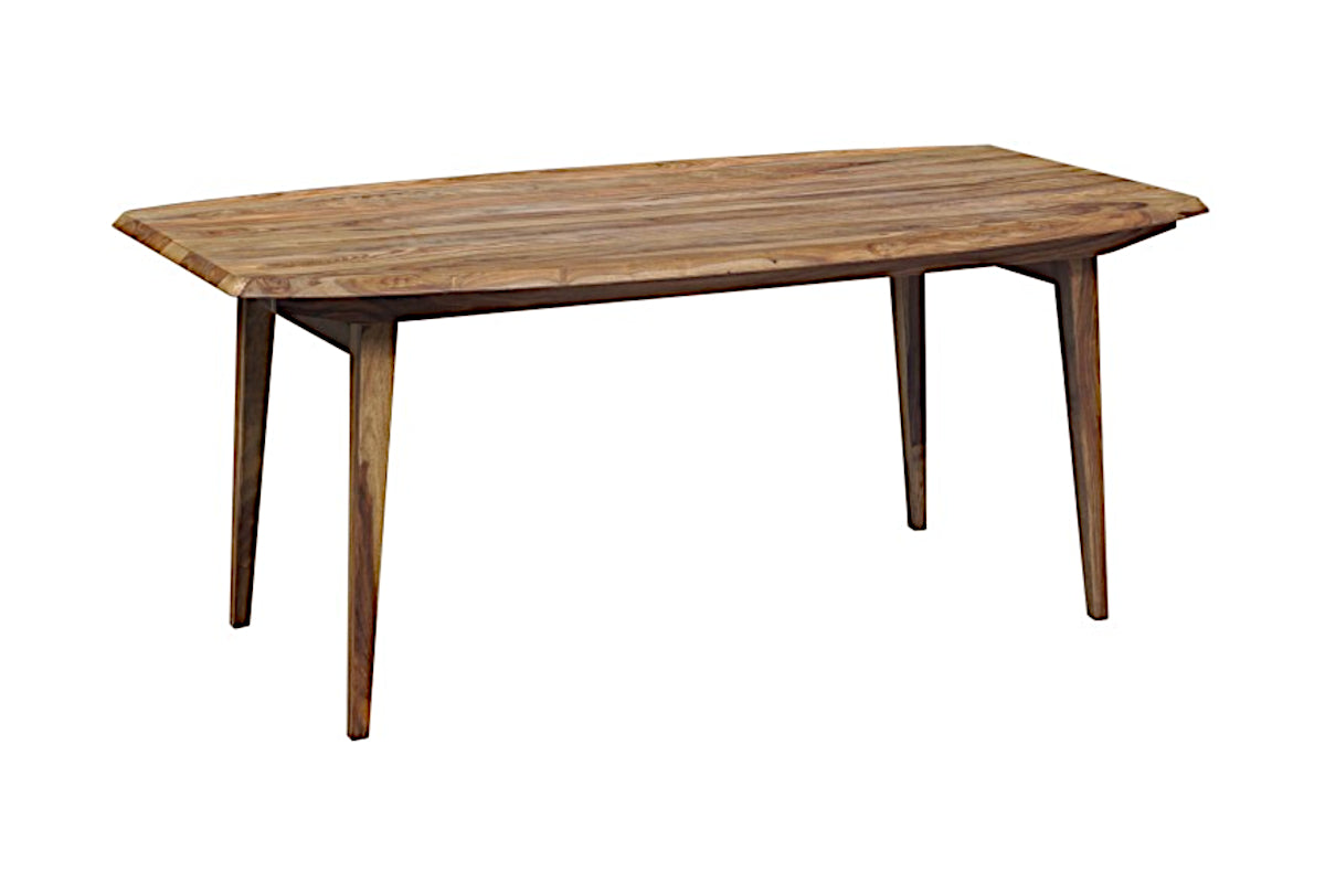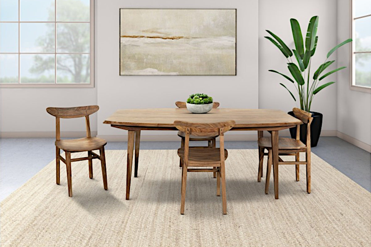 The solid sheesham Fusion Dining Set is an heirloom quality mid century modern collection. Built solidly, each piece is built to stand up to modern life. With elegant curved chair backs and seat and tapered edges on the dining table, the craftmanship and beauty of this solid wood collection is truly evident. The Fusion Dining Table is handcrafted in India, and is truly one of a kind!