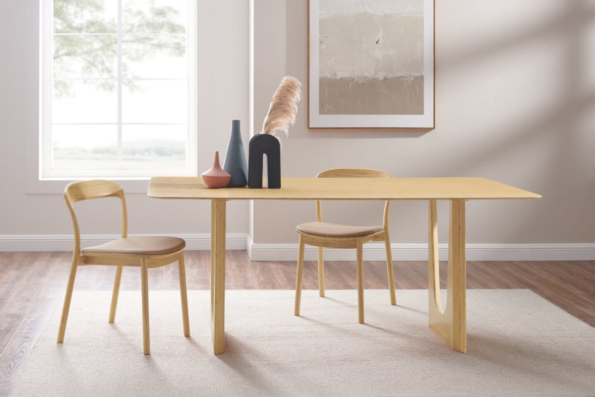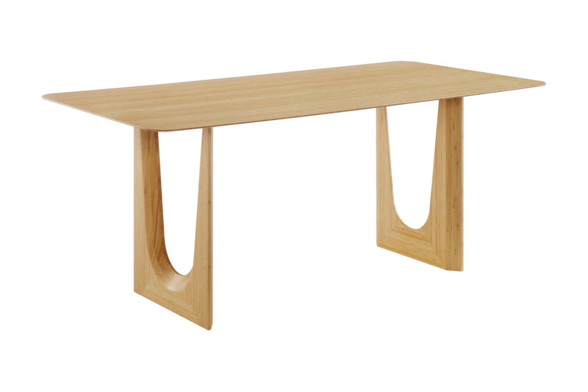 Sustainably crafted in solid bamboo, the Hanna dining collection's eye-catching style makes a statement with a reverse knife edge tabletop on a dynamic, architecturally inspired base. Simply designed, Hanna’s shapely base provides an elegant silhouette, while the nature-inspired wheat bamboo gives the table a clean, contemporary look. Ideal for the modern home, the Hanna table seats six to create a natural gathering space for family, guests, and workmates alike.