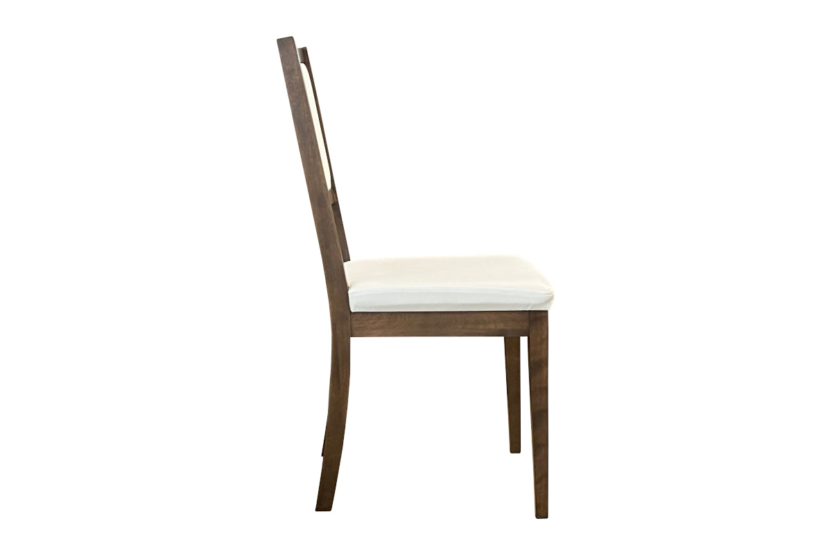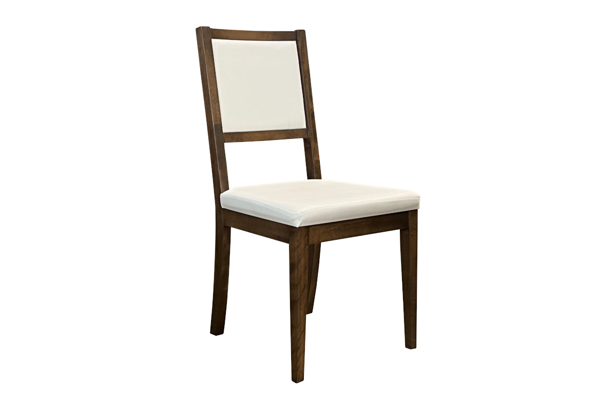 Dining chair crafted with solid hickory wood construction with white synthetic leather seat.
