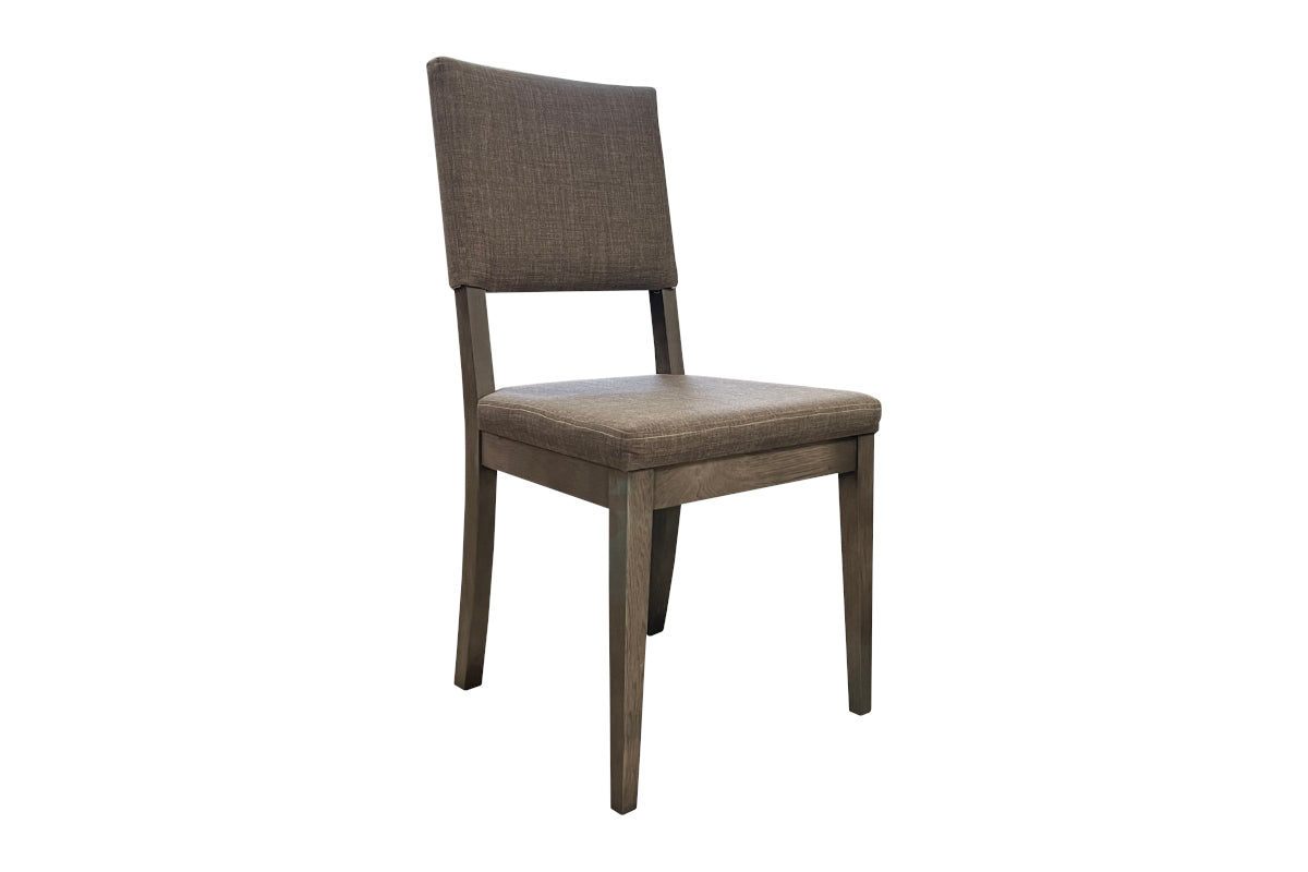 Dining chair crafted with solid hickory wood construction and gray fabric upholstery.