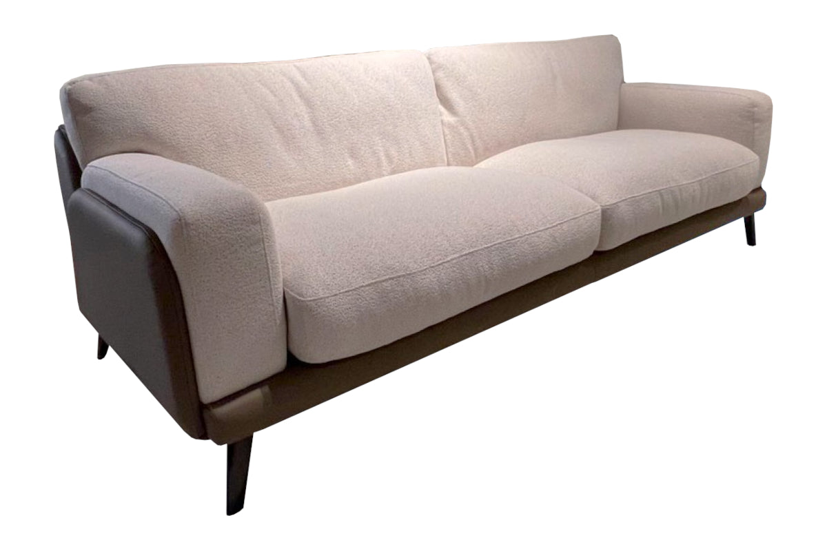 The Kobe Sofa features Biscuit fabric upholstered cushions and armrests with Cacao Brown leather on the back and ends.