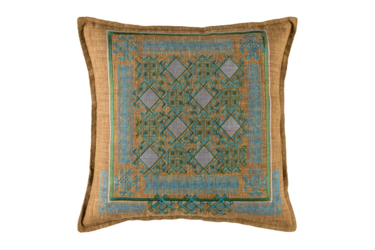 The Litavka decorative accent pillow features an aqua, grass green, medium brown, and off-white woven polyester front with a 100% cotton back.