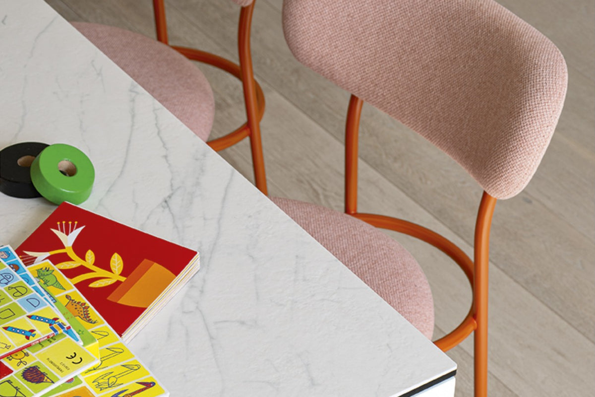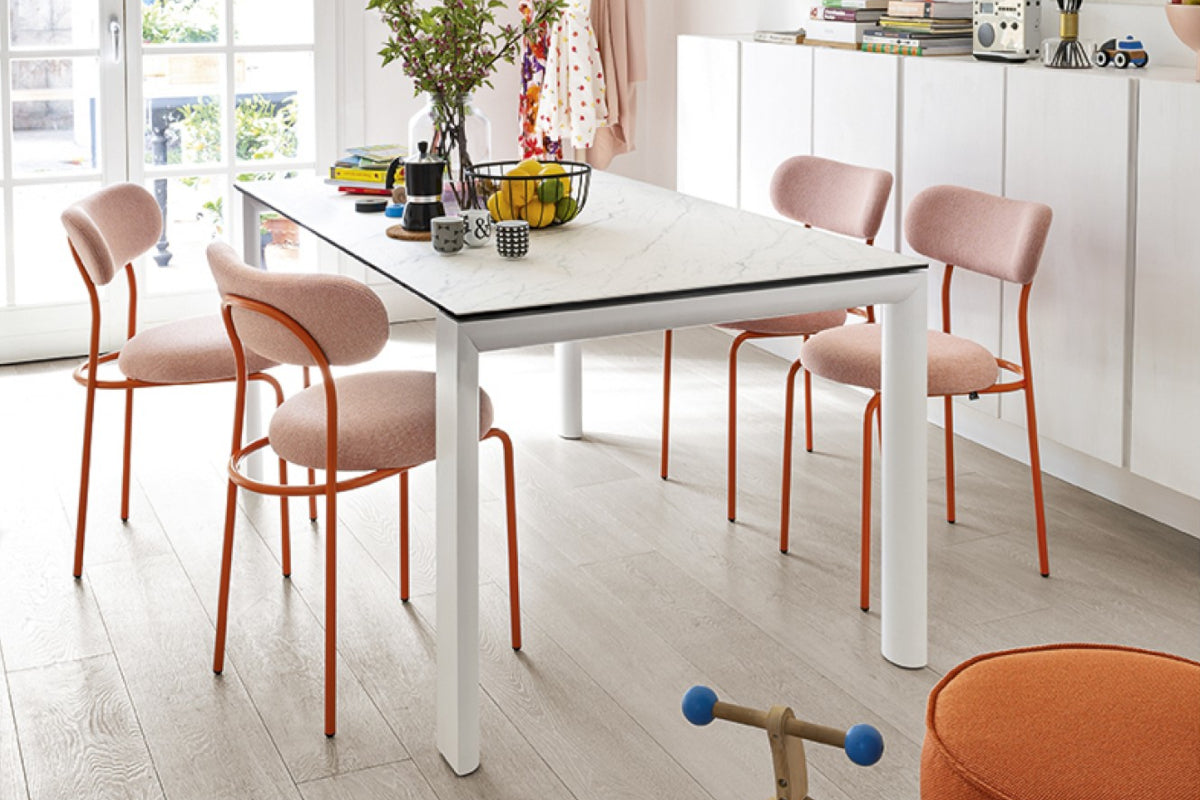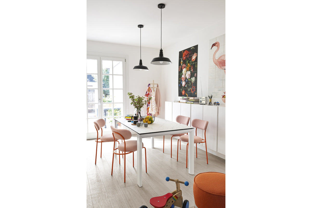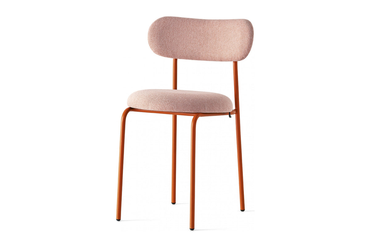 The Loop dining chair combines a saffron yellow painted metal frame with pink fabric to create stylish and comfortable chairs for any dining setting.