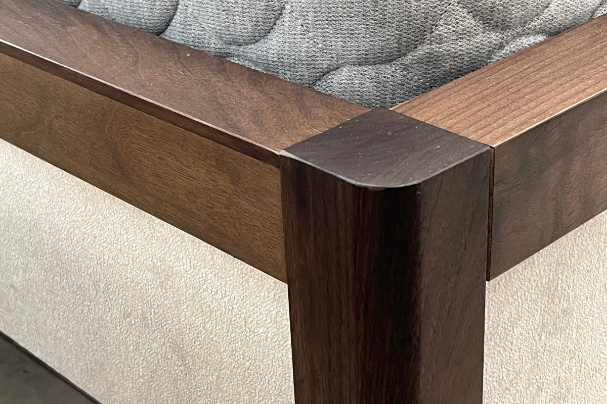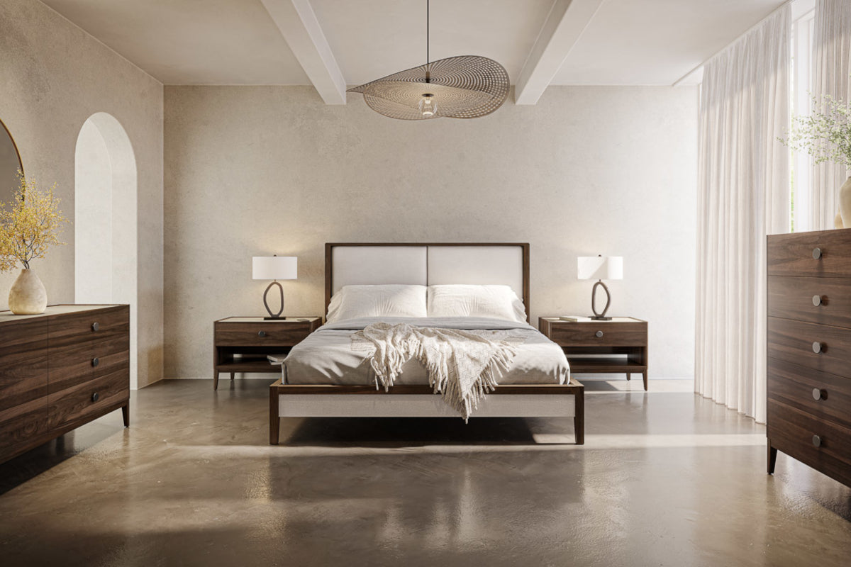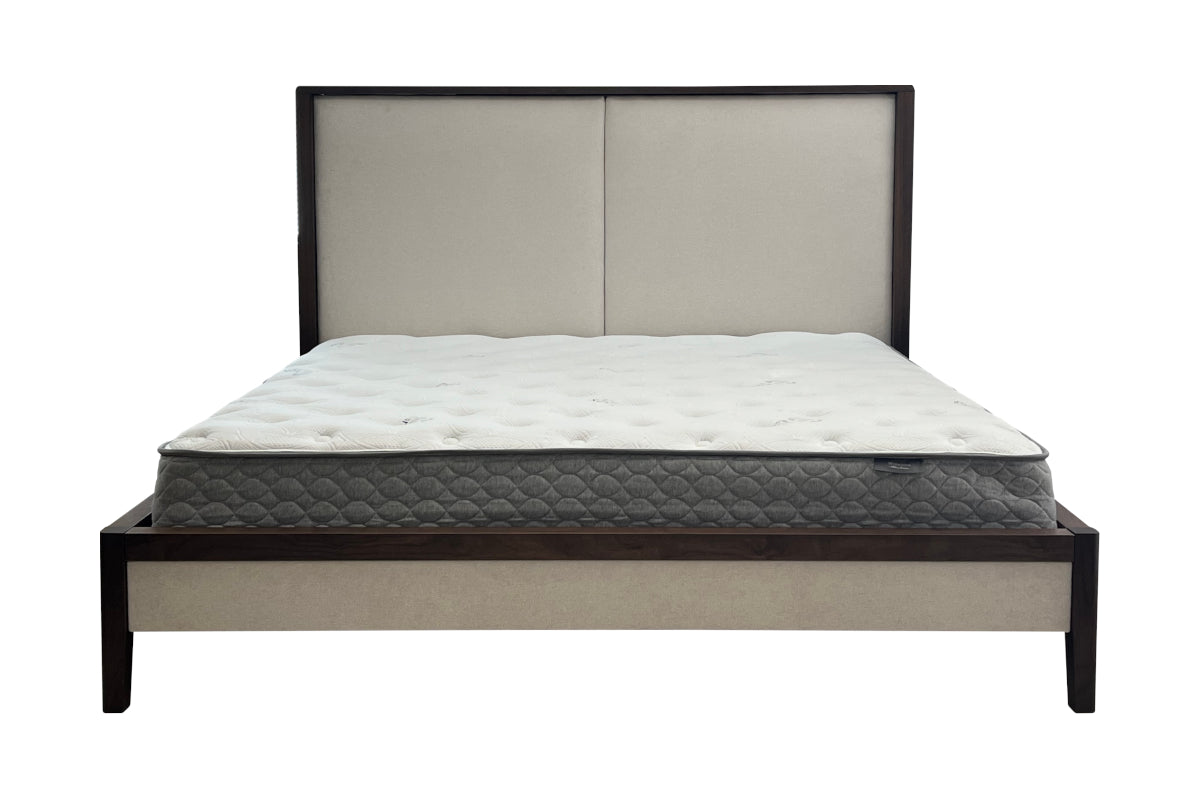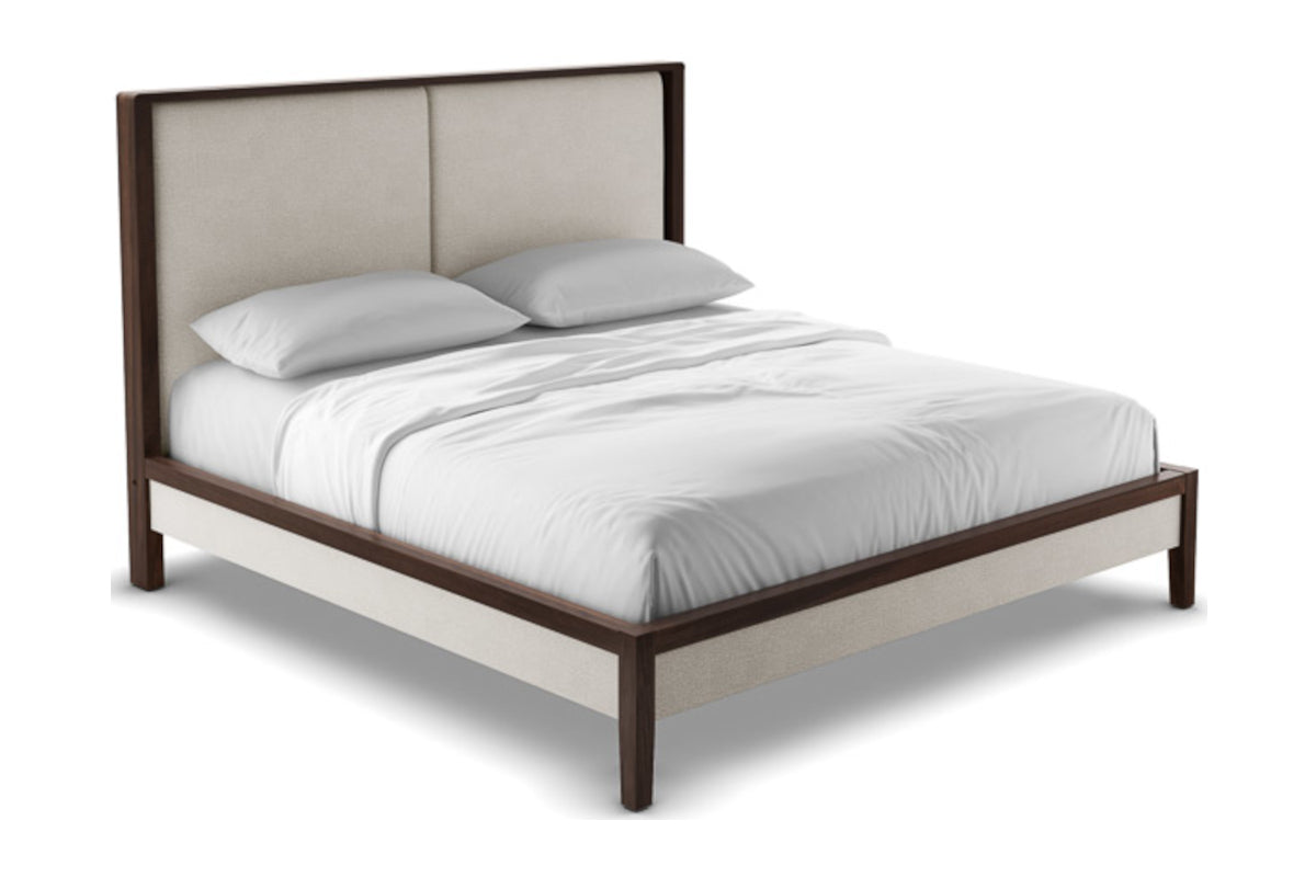 The Parma King Bed is crafted in Canada with a boca cream fabric and walnut frame. It features invisible reading lights with integrated individual controls and a removable base to accommodate adjustable metal mattress bases.