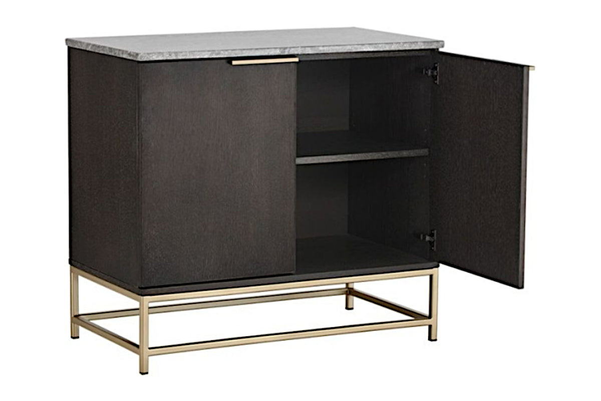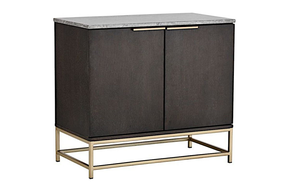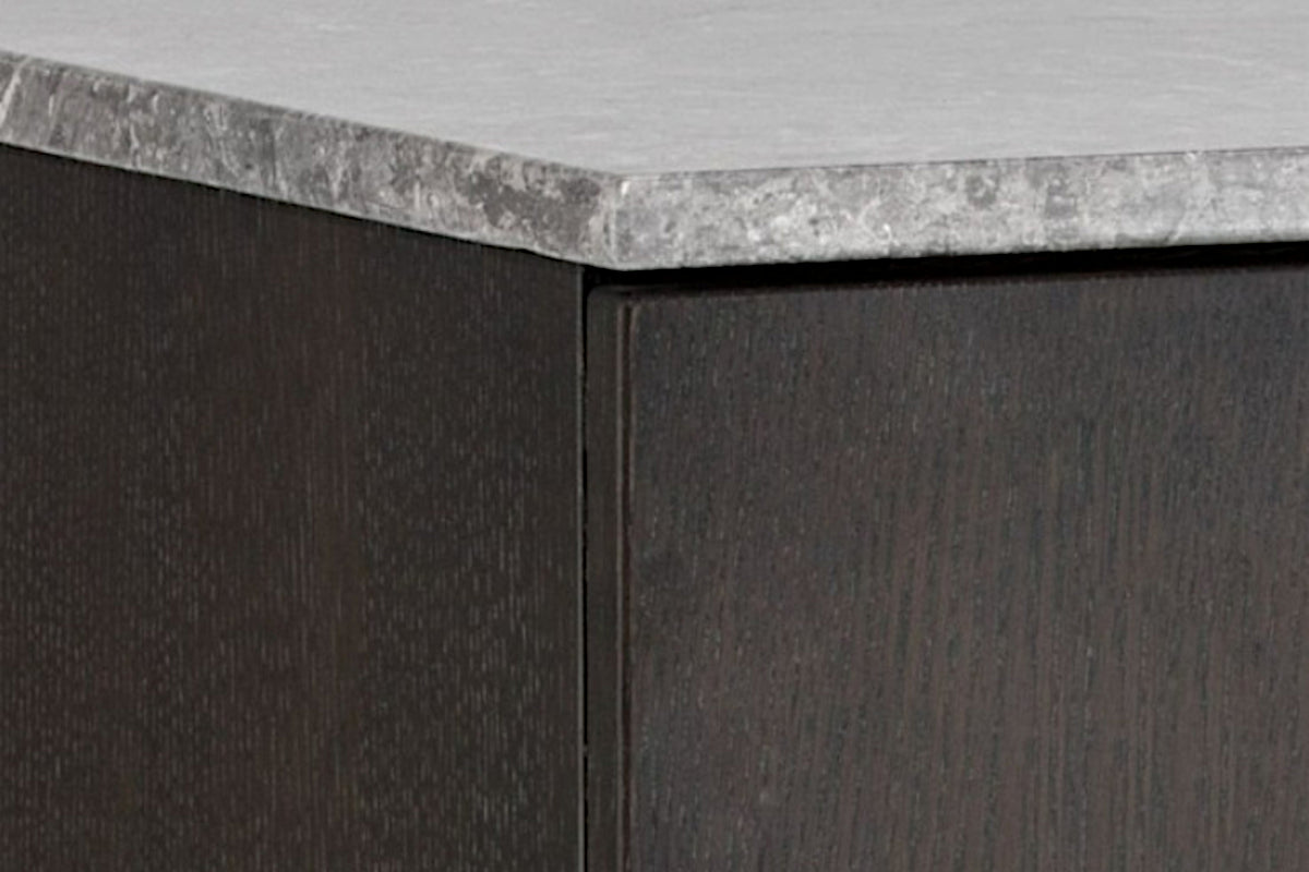 A contemporary sideboard designed to add a beautiful touch to the living, lounge, office and dining spaces. Crafted from charcoal grey oak veneer with two cabinets and shelves for added storage. A light grey marble top and brushed gold iron hardware completes the look.