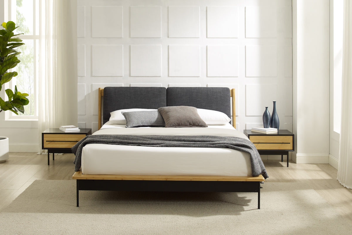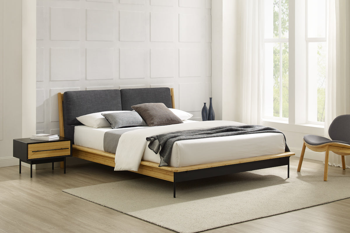 Create a casual and sophisticated look with Greenington’s Santa Cruz bedroom collection. The sleek modern design and simple clean lines of the Santa Cruz platform bed features a craftsman-built frame in solid Wheat bamboo, with two removable back cushions adding a dramatic focal point to the headboard, angled for good looks and comfortable lounging in bed. Heightening Santa Cruz’s upscale style is a slim black steel support and legs accenting the solid Wheat bamboo side rails and footboard.