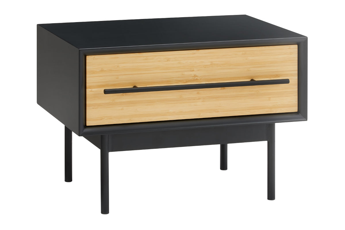 Sustainable and earth friendly, Wheat is not a surface stain, the color is the result of an innovative process using heat, steam, and pressure to transform the solid bamboo material into light Wheat’s color. The Santa Cruz platform bed is designed for use with a mattress only, which is supported with a solid bamboo European slat system, eliminating the need for a box spring, and providing constant ventilation for your mattress. Available in Queen, Eastern King, and California King sizes. The sleek modern design and simple clean lines of the Santa Cruz high chest, dresser, and nightstand features a craftsman-built frame made from solid bamboo, lacquered in a matte black finish on a strong steel base. Black steel accents complement light Wheat bamboo drawers and black lacquer surfaces.