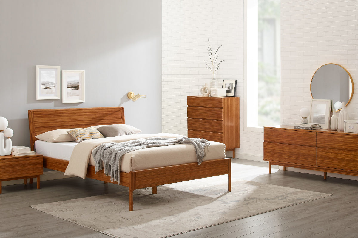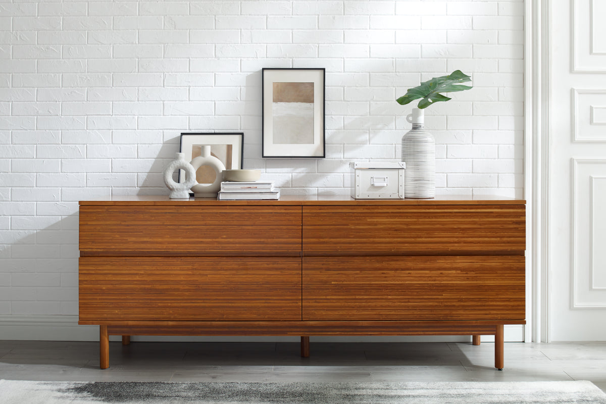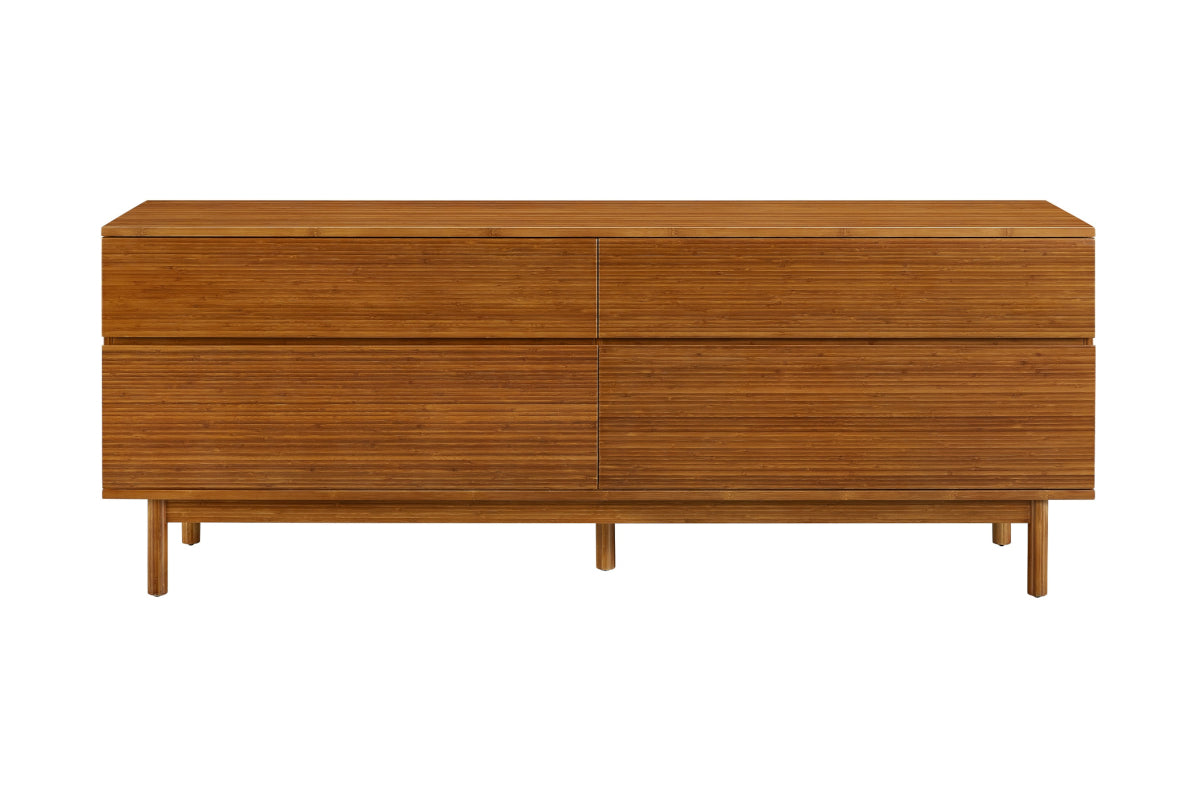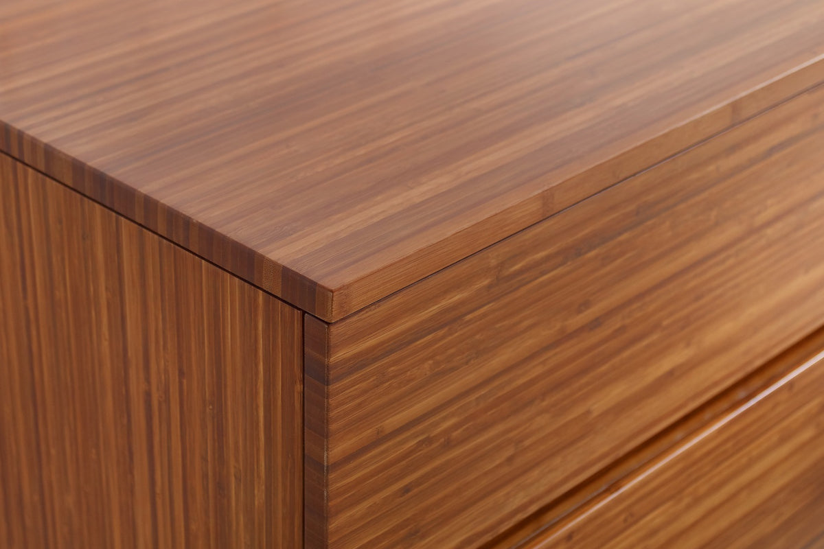 The quiet elegance of the Ventura four drawer double dresser is all about celebrating the beautiful grain of solid Amber bamboo. The modern style and simple clean lines of the dresser show off the rich variety of Amber’s colors and feature a craftsman-built frame made from solid bamboo, resting on legs that lift the chest up off the floor. Four wide solid bamboo drawers display expanses of rich bamboo grain uninterrupted by hardware, with each drawer beautifully finished inside and out. Each drawer is built using English dovetail joinery, and sit on under-mounted, soft-close glides for easy opening and closing.